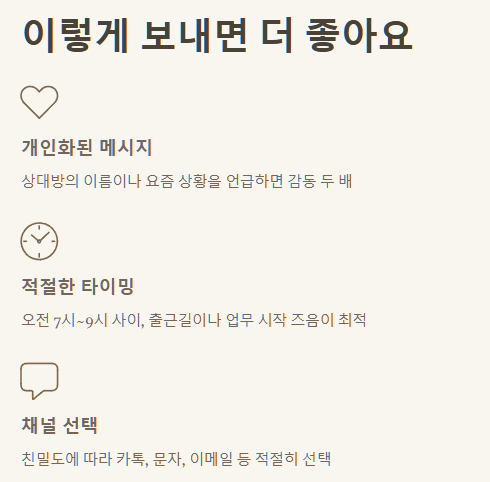 - 개인화와 타이밍이 중요: 상대방의 이름이나 상황을 언급하고, 오전 7~9시 사이에 보내면 감동이 배가 됩니다.