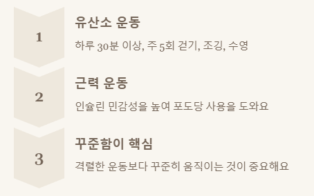 운동은 인슐린 민감성을 높여 세포가 포도당을 더 효과적으로 사용하도록 돕는답니다.