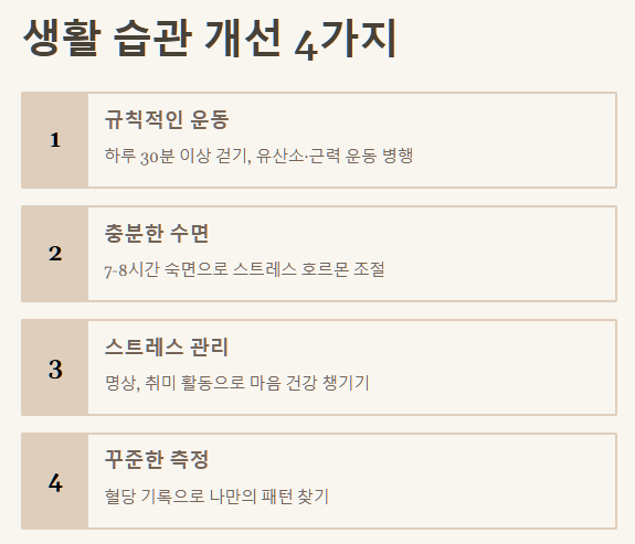 - ✅ 건강한 식단, 규칙적인 운동, 충분한 수면, 스트레스 관리가 혈당 조절에 핵심적인 역할을 합니다.