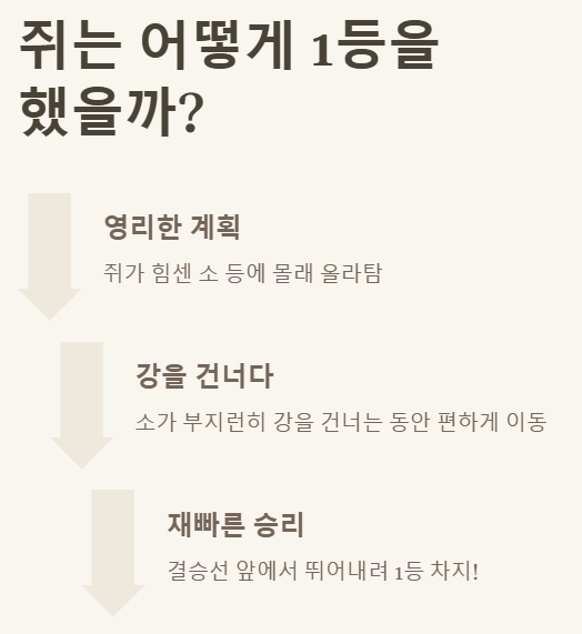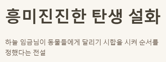 - 2. 순서는 '하늘 임금님의 달리기 시합' 설화를 통해 정해졌으며, 쥐의 지혜로움이 돋보입니다.