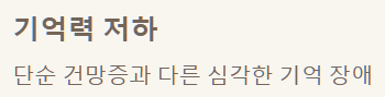 이 증상들이 서서히 진행되어 결국 독립적인 생활이 어려워질 수 있습니다. 쉽게 말해, 뇌의 여러 문제로 인해 생기는 ‘인지 기능 저하 현상’의 큰 틀이라고 보시면 돼요.