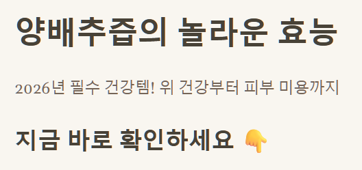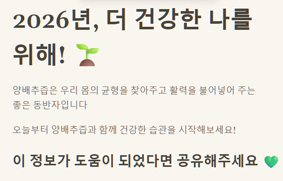 양배추즙은 단순히 하나의 건강 식품을 넘어, 우리 몸의 균형을 찾아주고 활력을 불어넣어 주는 좋은 동반자가 될 수 있습니다. 2026년을 맞아 더 건강하고 활기찬 삶을 꿈꾸신다면, 오늘부터 양배추즙과 함께 건강한 습관을 시작해보는 건 어떨까요? 제 글이 여러분의 건강한 삶에 작은 도움이 되었기를 진심으로 바랍니다. 다음에도 더 유익한 정보로 찾아올게요!