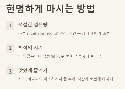 • 과다 섭취 금지: 너무 많은 양을 마시면 복통, 설사 등의 위장 장애를 유발할 수 있습니다.