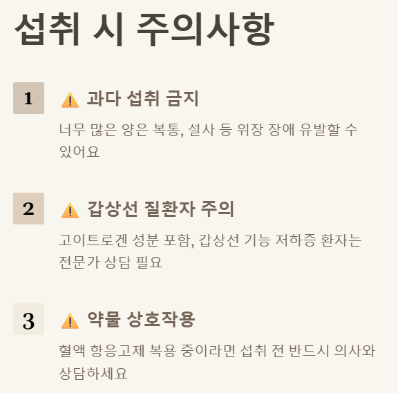 • 특정 약물과의 상호작용: 혈액 항응고제 등을 복용 중이라면 섭취 전 반드시 의사와 상담하세요.