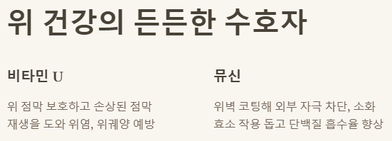 1. 위 점막 보호 및 재생: 비타민 U와 뮤신이 위염, 위궤양 완화에 탁월해요.