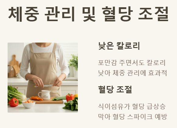 • 낮은 칼로리: 포만감을 주면서도 칼로리가 낮아 체중 관리에 효과적입니다.