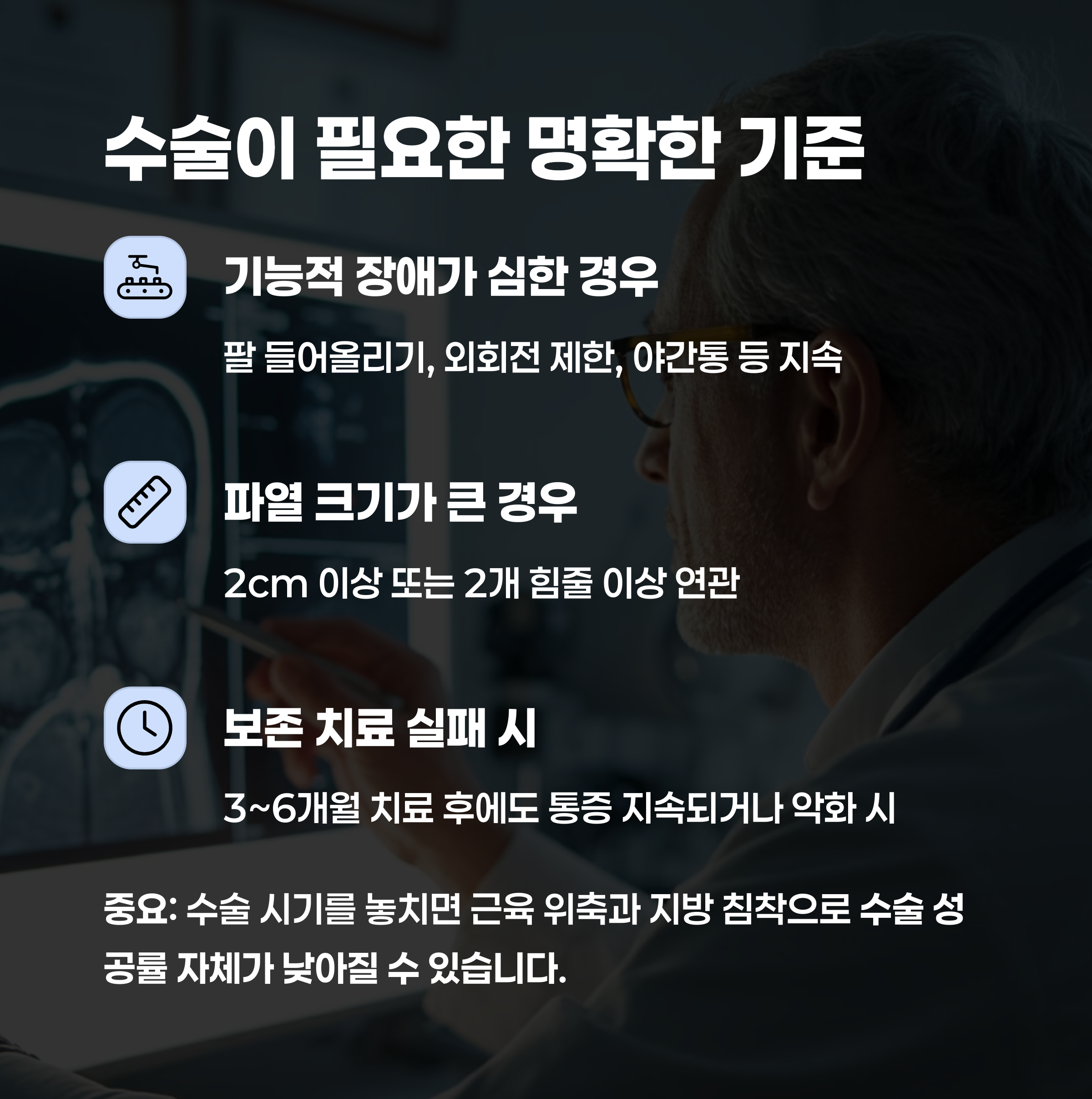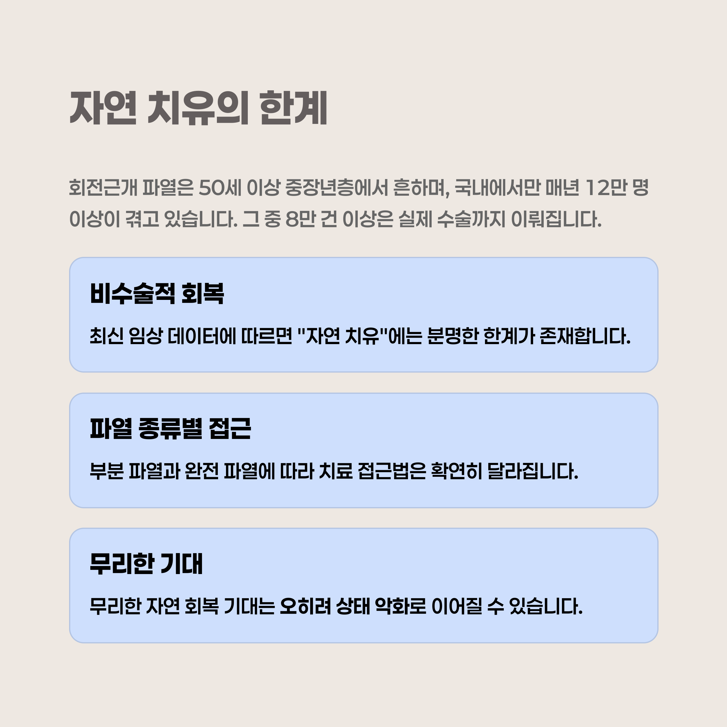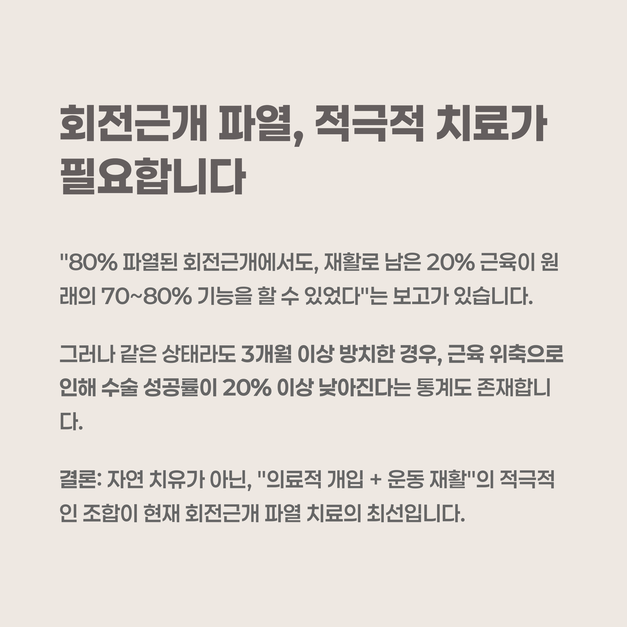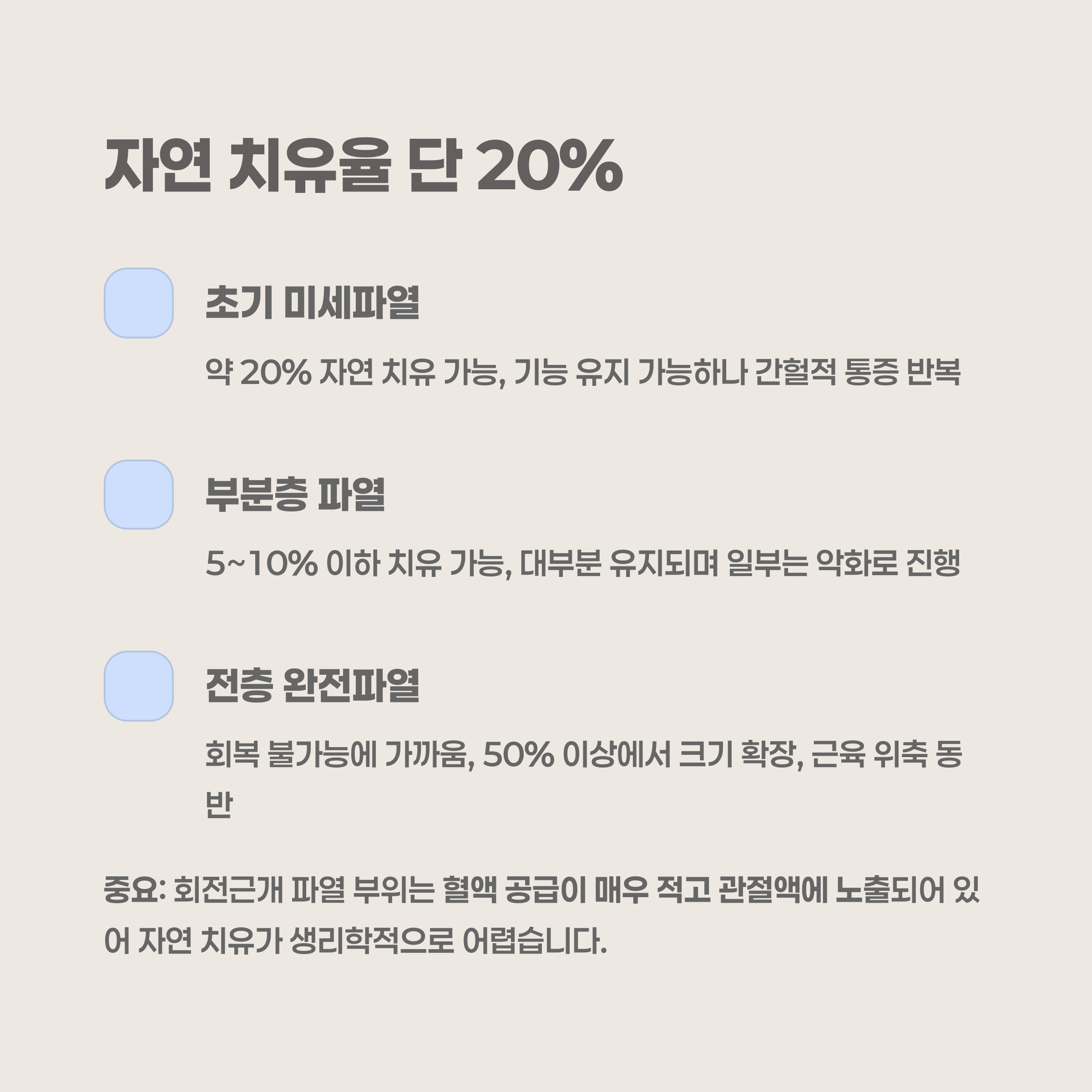 | 전층 완전파열 | 회복 불가능에 가까움 | 50% 이상에서 크기 확장, 근육 위축 동반 |