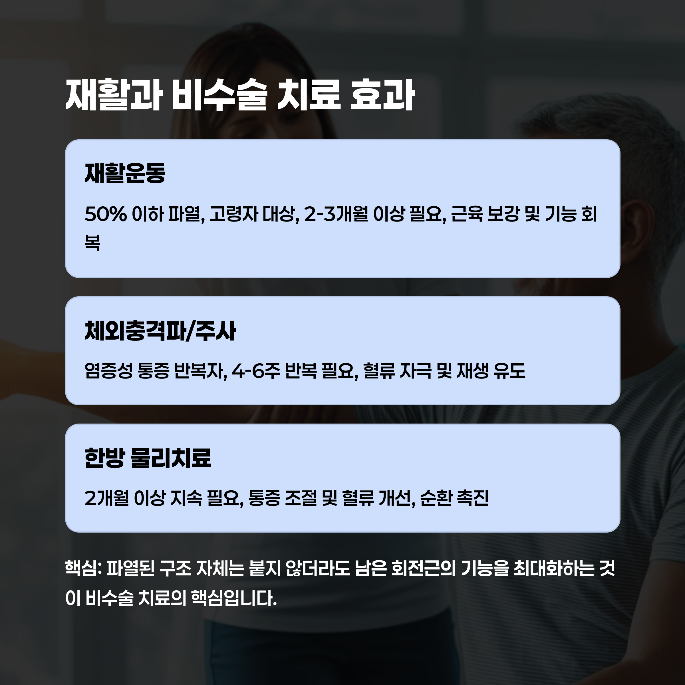 | 재활운동 | 50% 이하 파열, 고령자, 수술 부담자 | 2~3개월 이상 | 근육 보강, 기능 회복, 통증 완화 |