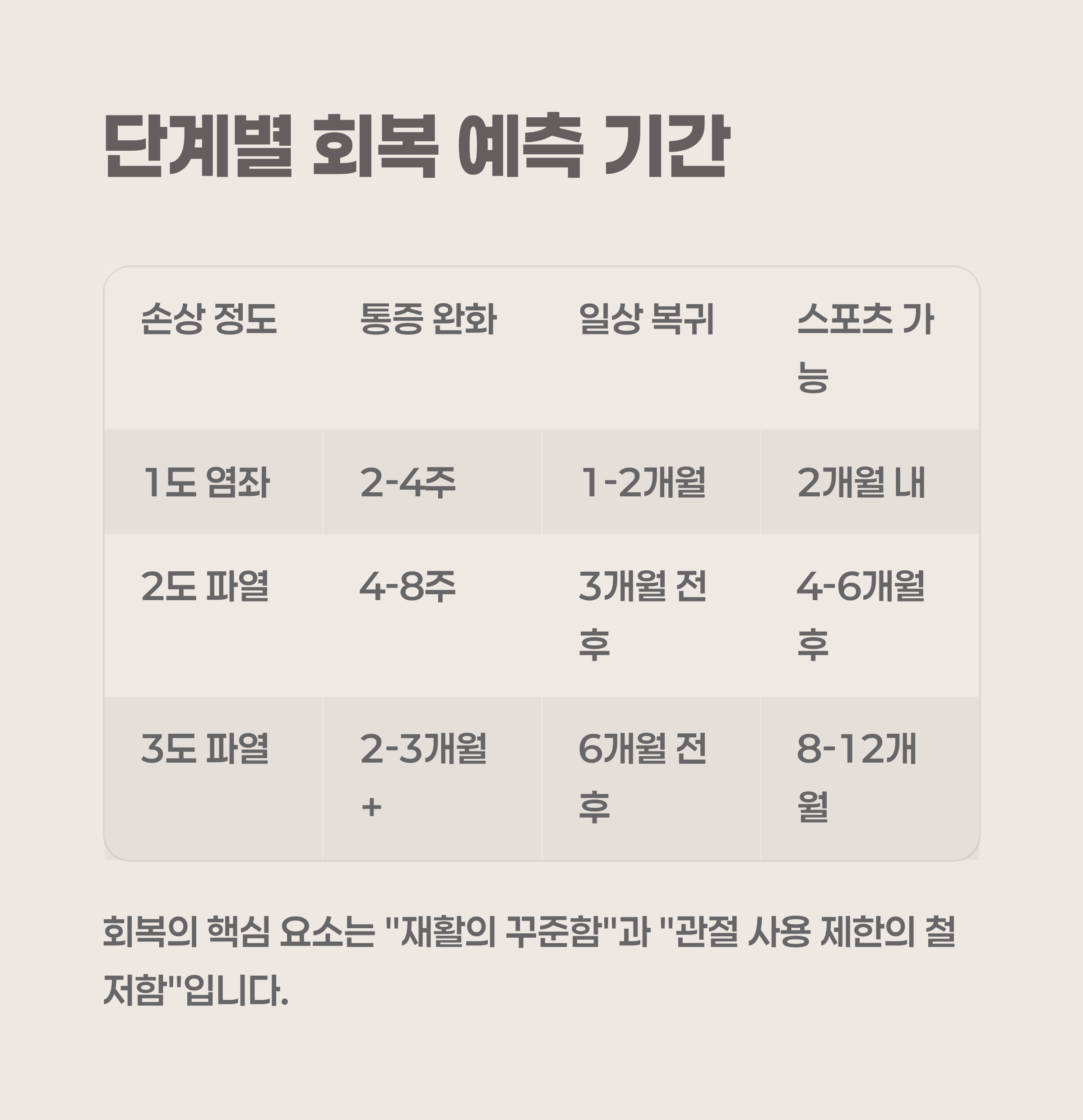 | 손상 정도 | 회복 방법 | 통증 완화 기간 | 일상 복귀 시점 | 스포츠 활동 가능 시기 |