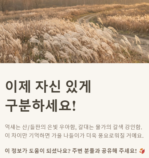 - ✅ 상징: 억새는 쓸쓸함, 갈대는 강인함.