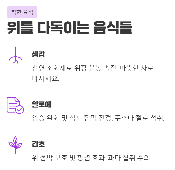 - 감초: 위 점막 보호 및 항염 효과가 있지만, 과다 섭취는 주의해야 합니다.