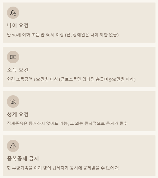 - ✅ 소득 요건: 연간 소득금액 100만원 이하 (근로소득만 있다면 총급여 500만원 이하)