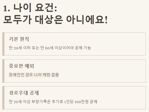 - ✅ 나이 요건: 만 20세 이하 또는 만 60세 이상 (단, 장애인은 나이 제한 없음)