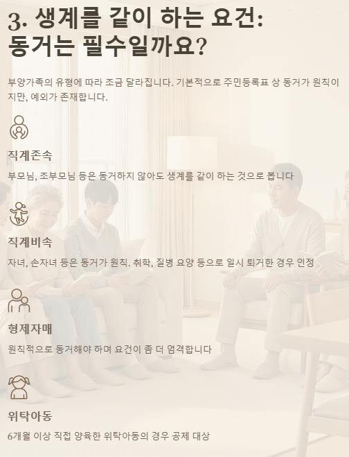 - 형제자매: 원칙적으로 동거해야 합니다. 이 경우는 동거 요건이 좀 더 엄격하다고 볼 수 있죠.