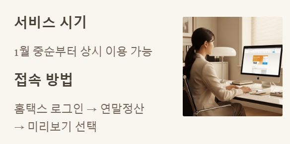 • 서비스 시기: 2025년 귀속분 기준 홈택스 연말정산 미리보기는 1월 중순 전후 개통되며, 상시 이용 가능합니다.