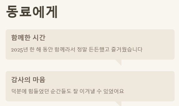 - (동료에게) "○○님, 2025년 한 해 동안 함께라서 정말 든든했고 즐거웠습니다! ○○님 덕분에 힘들었던 순간들도 잘 이겨낼 수 있었어요. 다가오는 새해에도 좋은 동료로 함께하고 싶습니다. 따뜻한 연말 보내시고 새해 복 많이 받으세요!"