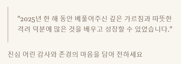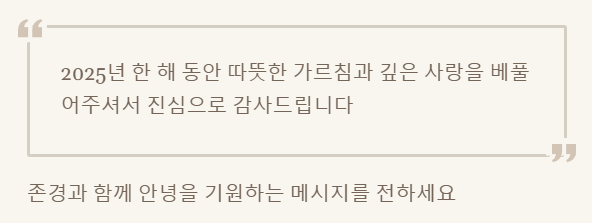 - "선생님/교수님, 2025년 한 해 동안 늘 따뜻한 가르침과 깊은 사랑을 베풀어주셔서 진심으로 감사드립니다. 덕분에 제가 바른 길로 나아갈 수 있었습니다. 다가오는 2026년에도 늘 건강하시고 평안하시기를 기원합니다. 따뜻한 연말 보내세요."