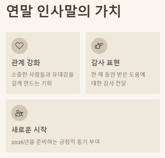 • 새로운 시작 준비: 지난 한 해를 잘 마무리하고, 새로운 마음으로 다가올 2026년을 계획하는 데 긍정적인 동기를 부여합니다. 인사말을 쓰는 저 자신도 마음을 다잡게 되더라고요.
