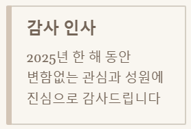 • "선생님/교수님, 2025년 한 해 동안 늘 따뜻한 가르침과 깊은 사랑을 베풀어주셔서 진심으로 감사드립니다. 덕분에 제가 바른 길로 나아갈 수 있었습니다. 다가오는 2026년에도 늘 건강하시고 평안하시기를 기원합니다. 따뜻한 연말 보내세요."