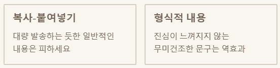 ⚠️ 복사-붙여넣기 느낌의 인사말: 대량 발송하는 듯한 느낌을 주는 너무 일반적이거나 복사-붙여넣기 한 듯한 내용은 피하세요. 상대방은 즉시 알아챕니다. 이건 정말 최악이에요.