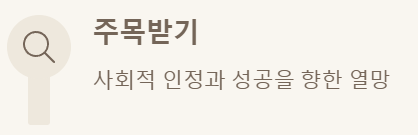 • 사회적 인정 욕구: 사람들에게 주목받고 싶거나 인정받고 싶은 강한 마음.