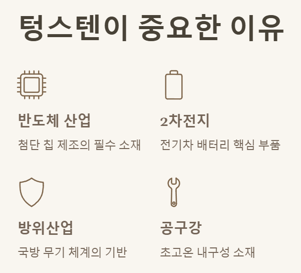 텅스텐은 녹는점이 매우 높고 강도가 뛰어나 반도체, 2차전지, 공구강, 방위산업 등 첨단 산업 전반에 걸쳐 필수적인 희소금속입니다. 없어서는 안 될 핵심 광물인 셈이죠.