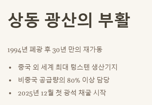 | 2026년 1월 | 상동 광산이 미국의 국가 안보 측면에서 전략적 자산으로 부각. 미국 기반 기업 통한 중국 외 텅스텐 공급망 강화 구조 재차 강조. |