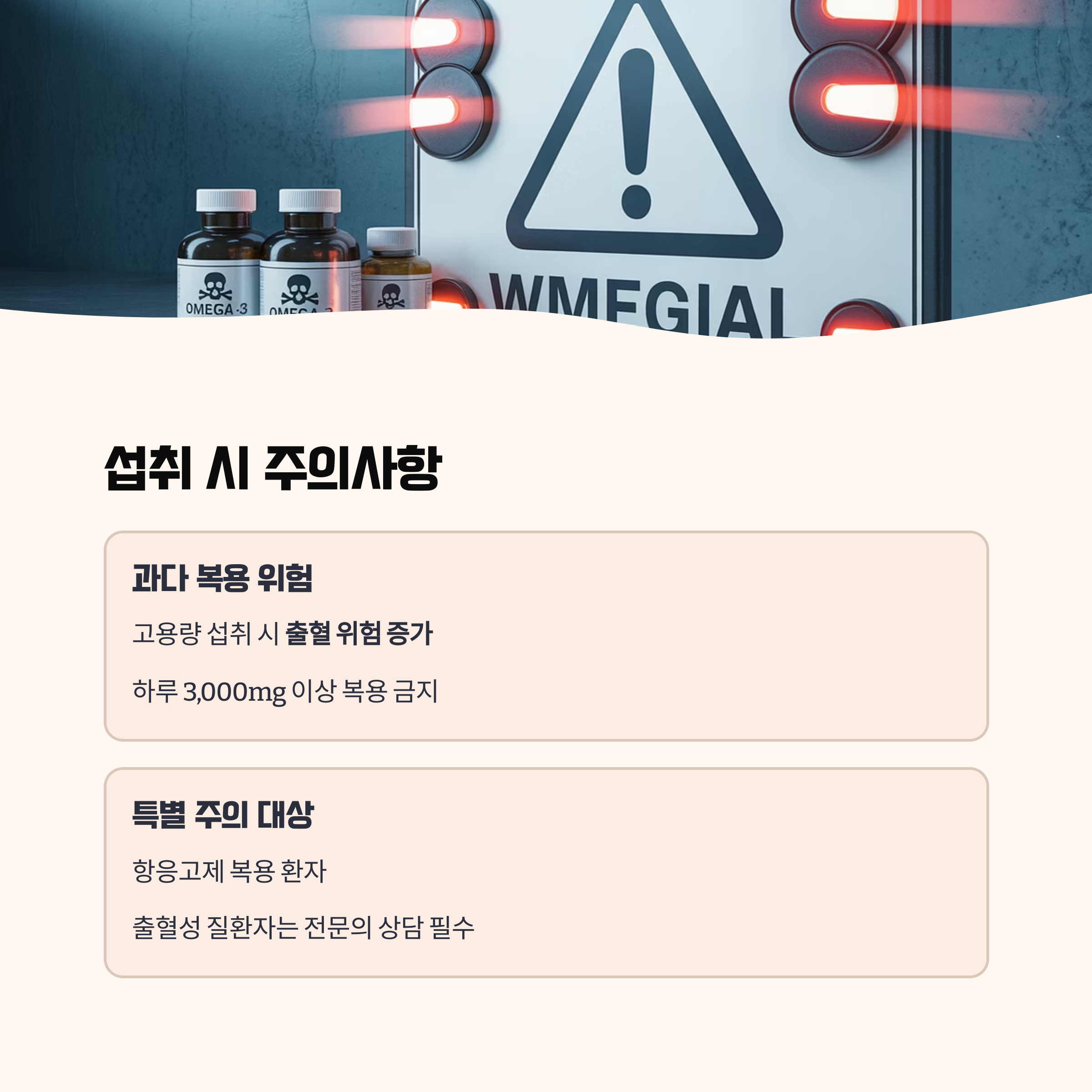 오메가3는 고용량 섭취 시 출혈 위험 증가 등의 부작용이 있습니다.