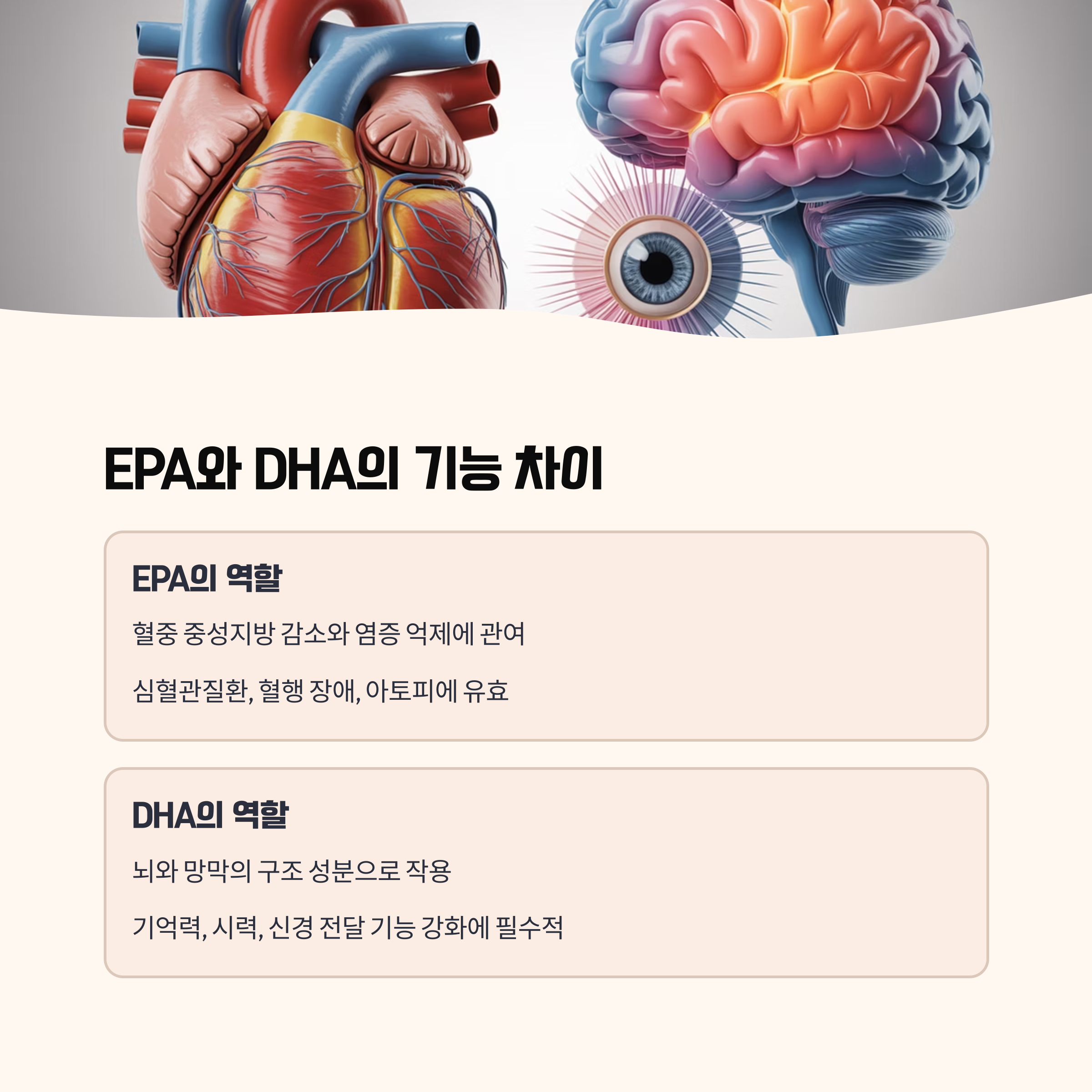따라서, "EPA는 혈관과 염증", "DHA는 뇌와 시력"이라고 정리할 수 있습니다.