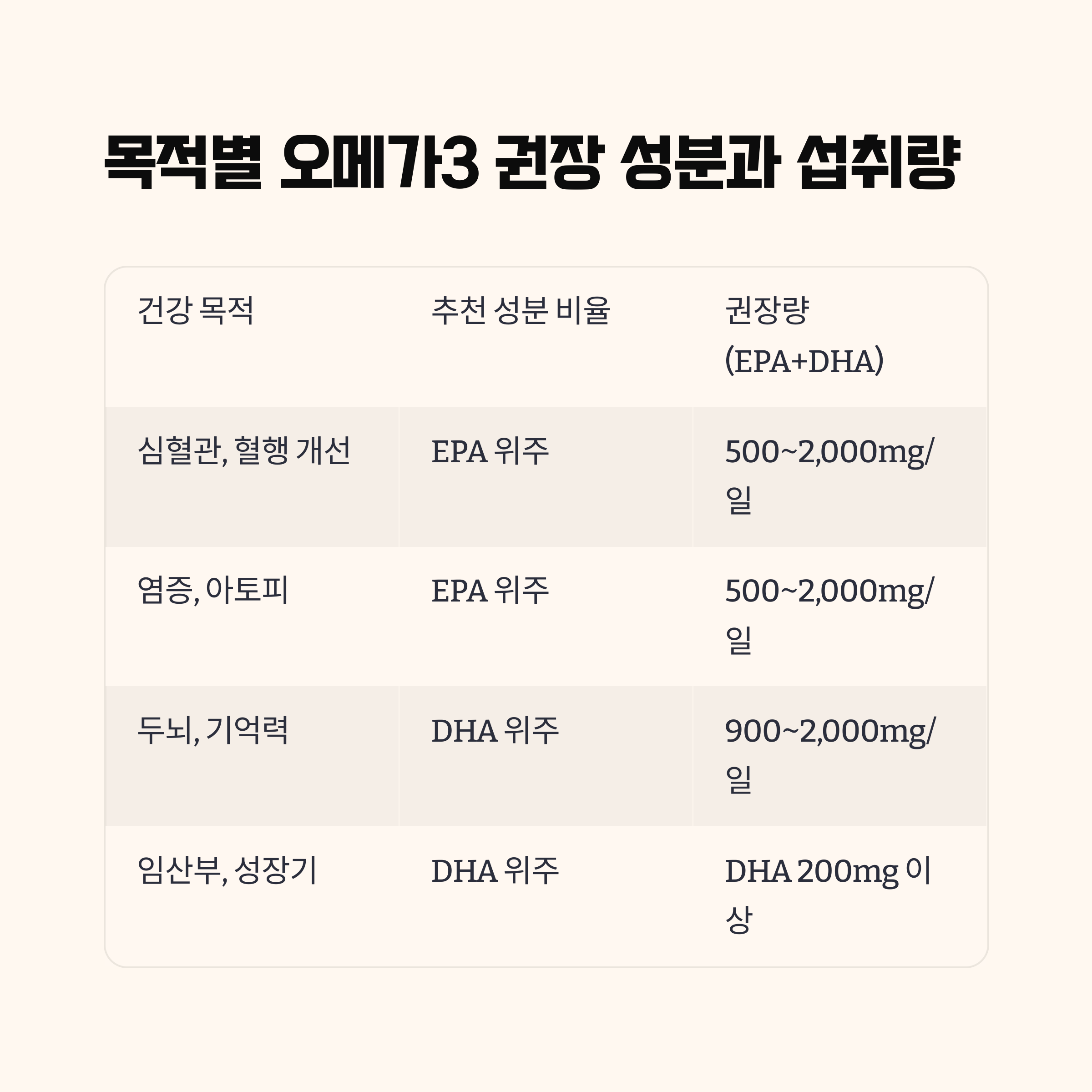 | 염증, 아토피, 알레르기 | EPA 위주 | 500~2,000mg/일 |