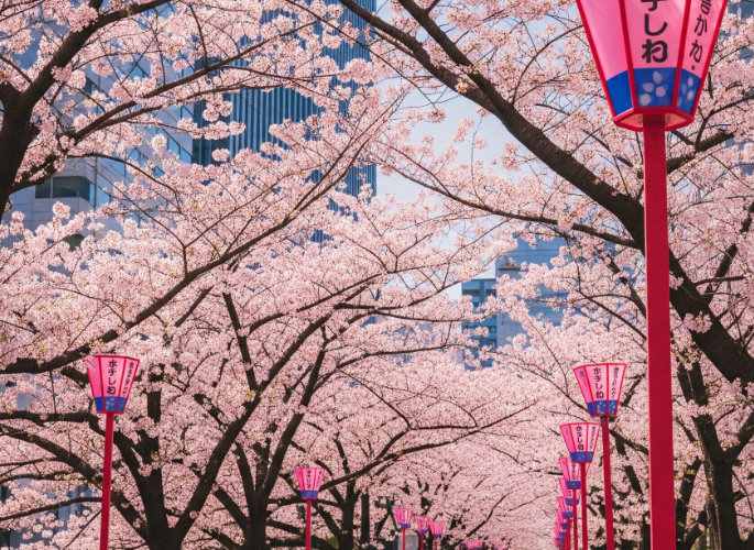 밤에는 라이트업도 진행되어 더욱 특별한 분위기를 연출합니다. - 일본 조폐국 벚꽃길 (조폐국 벚꽃 터널): 매년 벚꽃 개화 시기에 맞춰 일주일 정도만 개방하는 특별한 벚꽃 명소입니다.