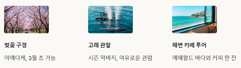 - ✔ 즐길거리: 고래 관찰 (시즌 막바지), 해변 산책, 실내 관광(수족관, 박물관).