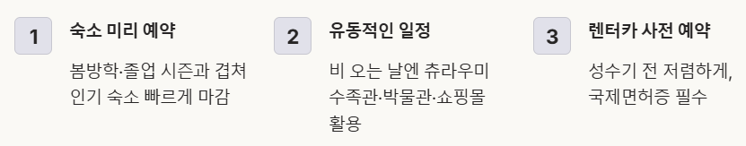 - ✔ 꿀팁: 렌터카 필수, 숙소 미리 예약, 유동적인 일정 계획하기.