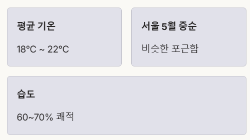 - ✔ 옷차림: 얇은 긴팔, 반팔과 함께 가벼운 카디건/점퍼 필수 (일교차 대비).