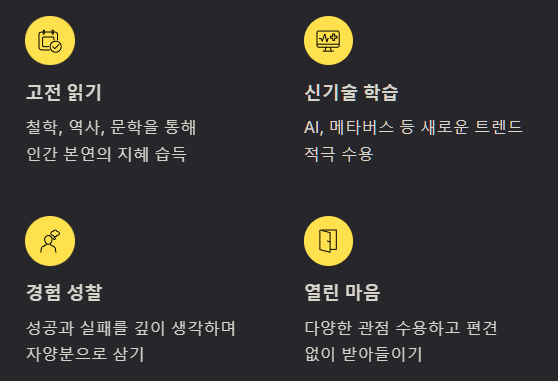 - 고전 읽기 습관화: 철학, 역사, 문학 등 고전을 읽으며 인간 본연의 지혜와 통찰력을 기르는 것이 중요하다고 생각해요.