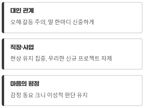 특히 대인 관계에서 오해나 갈등이 생길 수 있으니, 말 한마디 행동 하나에 신중을 기해야 합니다.