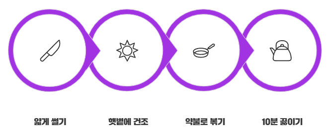 고소한 향이 올라오면 잘 볶아진 거예요. - 차 끓이기: 볶은 우엉 10~15g을 물 1~2L에 넣고 약 10분 정도 끓여주세요.
