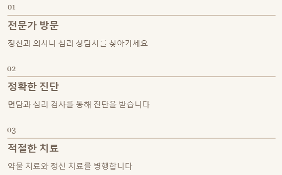 - 4. 자가 진단은 위험하며, 반드시 전문가의 도움이 필요합니다. 정신건강의학과 방문을 통해 정확한 진단과 적절한 치료를 받는 것이 회복의 첫걸음입니다.