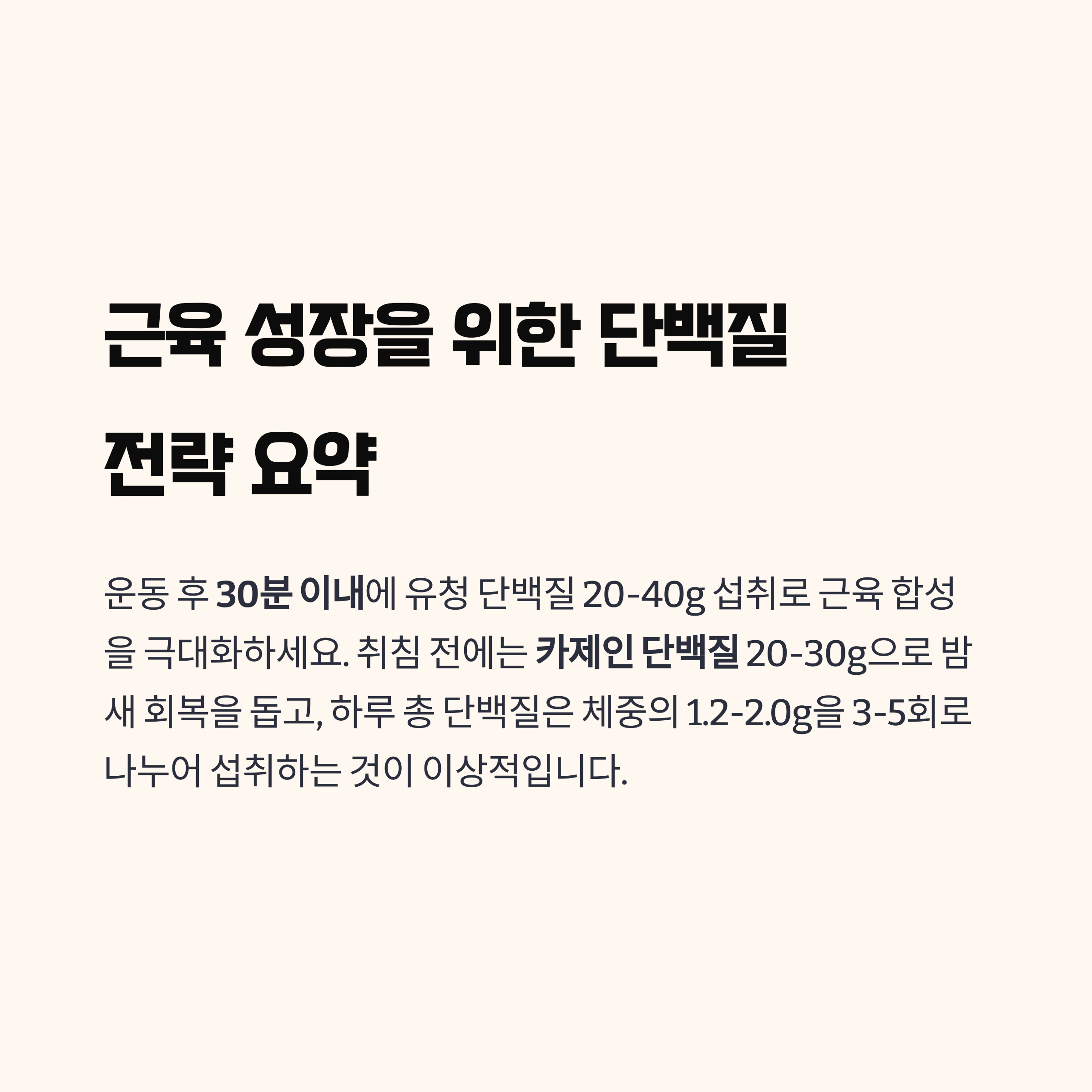 | 운동 후 30분 | 20~40g | 근육 합성률 최대, 성장 촉진 |