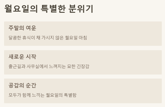 월요일은 주말 이후 다시 일상으로 돌아오는 날이라 많은 사람이 부담을 느끼기 쉬워요. 이때 건네는 따뜻한 인사는 부담감을 덜어주고, 긍정적인 분위기를 조성하며, 관계를 돈독하게 만드는 데 큰 도움이 된답니다. 한 주의 시작을 활기차게 열어주는 역할을 하죠.