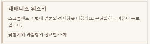 | 재패니즈 위스키 | 일본 | 균형감, 우아함, 꽃, 과일 | 섬세한 맛과 향을 선호하는 분 |