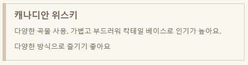| 캐나디안 위스키 | 캐나다 | 가벼움, 부드러움, 향신료 | 칵테일 베이스로 활용하고자 하는 분 |