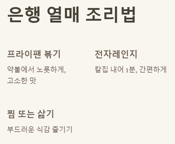 - 전자레인지: 은행 열매에 칼집을 내어 전자레인지에 1분 내외로 돌리면 간편하게 익힐 수 있어요.