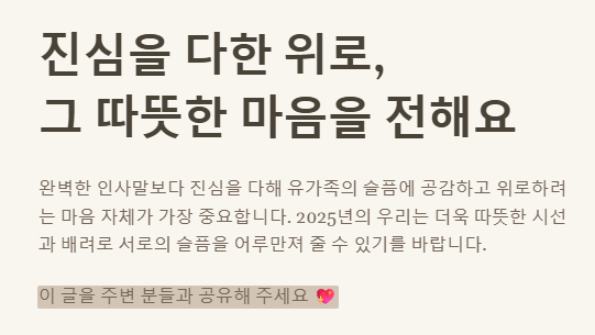 사랑하는 이를 떠나보내는 것은 누구에게나 힘든 일입니다. 2025년의 우리는 더욱 따뜻한 시선과 배려로 서로의 슬픔을 어루만져 줄 수 있으면 좋겠습니다. 이 글이 여러분의 소중한 마음을 전하는 데 작은 도움이 되기를 진심으로 바랍니다.
