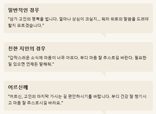 - 일반적인 경우: "삼가 고인의 명복을 빕니다. 얼마나 상심이 크실지… 뭐라 위로의 말씀을 드려야 할지 모르겠습니다."