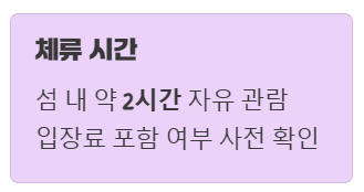 - 개인 음료/간식: 섬 내부에 식당이 거의 없고 카페도 제한적이니 간단한 음료나 간식을 챙겨가는 것이 좋아요.