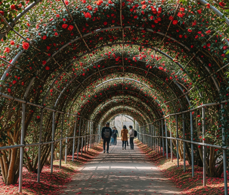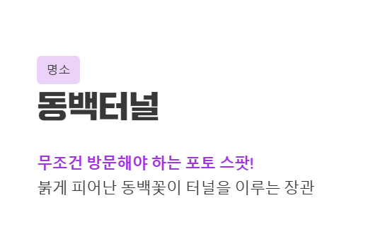- 동백터널: 붉게 피어난 동백꽃이 터널을 이루는 곳이에요.