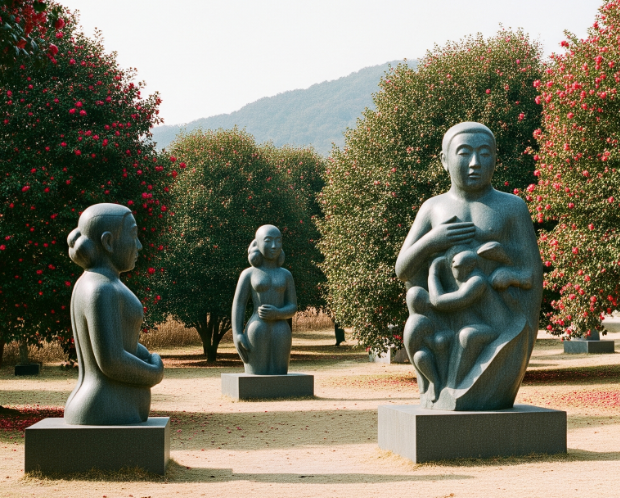 여기는 정말 무조건 방문해야 하는 포토 스팟입니다! - 조각공원: 아름다운 조각품들이 동백꽃과 어우러져 예술적인 분위기를 자아냅니다.
