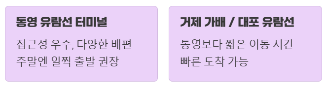 - 통영 유람선 터미널: 접근성이 좋고 다양한 배편이 있어요. 주말에는 일찍 출발하는 것이 좋습니다.