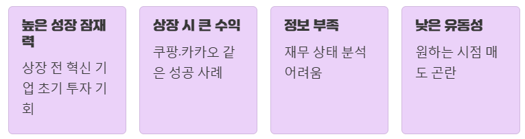 개별 기업의 리스크가 크기 때문에, 여러 기업에 분산 투자하여 위험을 줄이는 것이 현명합니다. - 장기적인 관점: 비상장 기업은 상장까지 시간이 오래 걸릴 수 있고, 그 과정에서 많은 변수가 발생할 수 있어요.